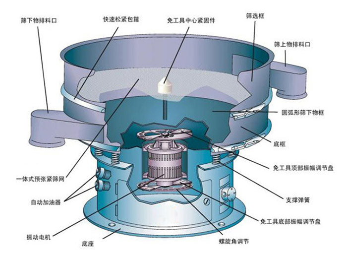 該設(shè)備采用直立式振動電機(jī)作為激振源,通過調(diào)節(jié)上下偏心重錘的相位角,使物料在篩面上做三維回旋運動,篩分過程較為均勻。其結(jié)構(gòu)設(shè)計注重實用性,采用全封閉形式,能有效防止粉塵外溢;配備彈跳球清網(wǎng)裝置,有助于減少堵網(wǎng)現(xiàn)象;篩網(wǎng)更換操作簡便,通常僅需3-5分鐘即可完成,便于日常維護(hù)與清潔。