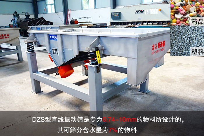 DZS型直線振動篩是專為0.74-10mm的物料所設計的,其可篩分含水量為7%的物料,主要的篩分物料是:磨料模具原料,塑料,化工,醫藥等干式的粉狀物料,以及細顆粒和細微粉物料等。
