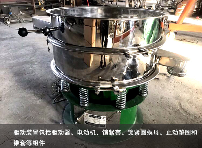 驅(qū)動裝置包括驅(qū)動器、電動機(jī)、鎖緊套、鎖緊圓螺母、止動墊圈和錐套等組件,其中,錐套固定在篩框上,驅(qū)動器的驅(qū)動軸設(shè)置在錐套內(nèi)并通過鎖緊套來連接固定其位置。本實(shí)用新型精細(xì)篩分機(jī)與現(xiàn)有篩分機(jī)相比具有結(jié)構(gòu)先進(jìn)實(shí)用、性能穩(wěn)定可靠、安裝調(diào)試方便、制造費(fèi)用低等優(yōu)點(diǎn)。