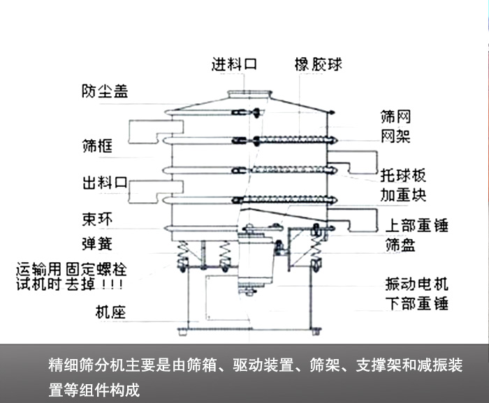 精細(xì)篩分機(jī)主要是由篩箱、驅(qū)動裝置、篩架、支撐架和減振裝置等組件構(gòu)成。